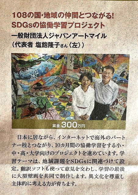 日本と海外の学校がSDGsをテーマに議論して自分達が創りたい未来を考え、未来へのメッセージを込めた成果物を生み出す国際協働学習が評価されました。