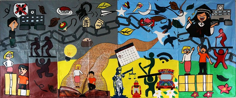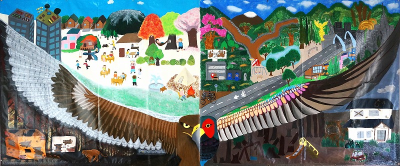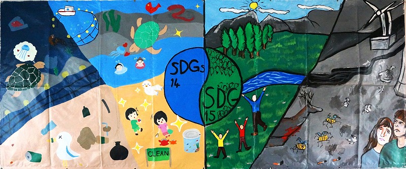 壁画は先に日本側が半分描いて海外校に送り、海外側で後の半分を描いて完成させます。学習テーマはSDGsから相手と共通のテーマを選んでいます。自分たちが直面している課題の解決をグローバルな視点で議論し、自分達が創りたい未来を描いています。